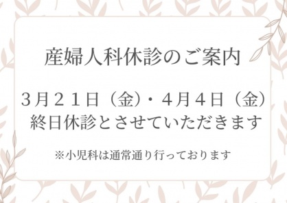 2025年03月06日(木) お知らせ 【産婦人科】3月・4月の休診について 産婦人科の休診日についてご案内です。 ★3月21日(金)、4月4日(金)の診療は当院の都合により終日休診とさせていただきます。 ※小児科は通常通り行っております。