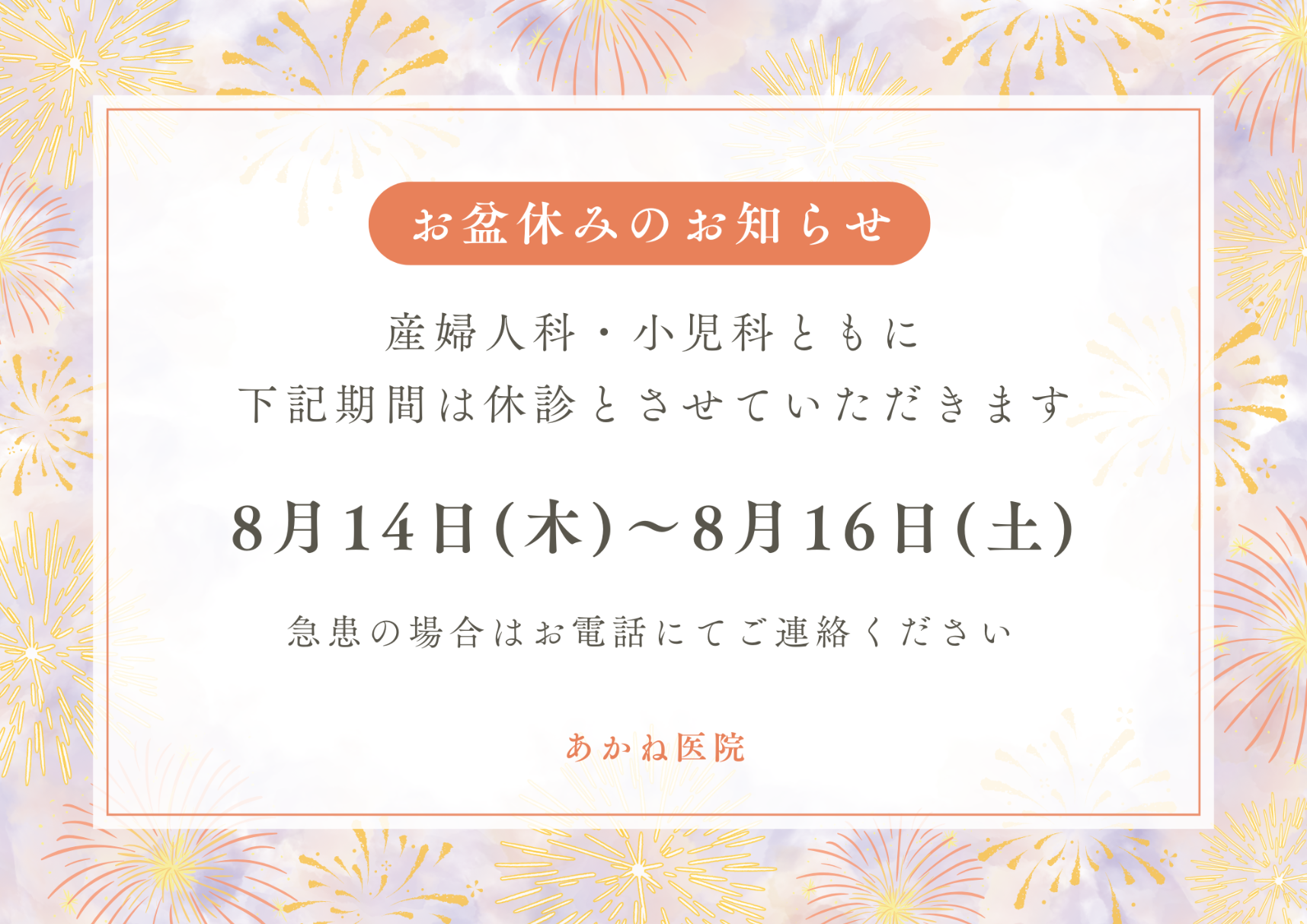 産婦人科・小児科ともに、8月14日~8月16日まで休診とさせていただきます。 緊急の方はお電話にてご連絡ください。
