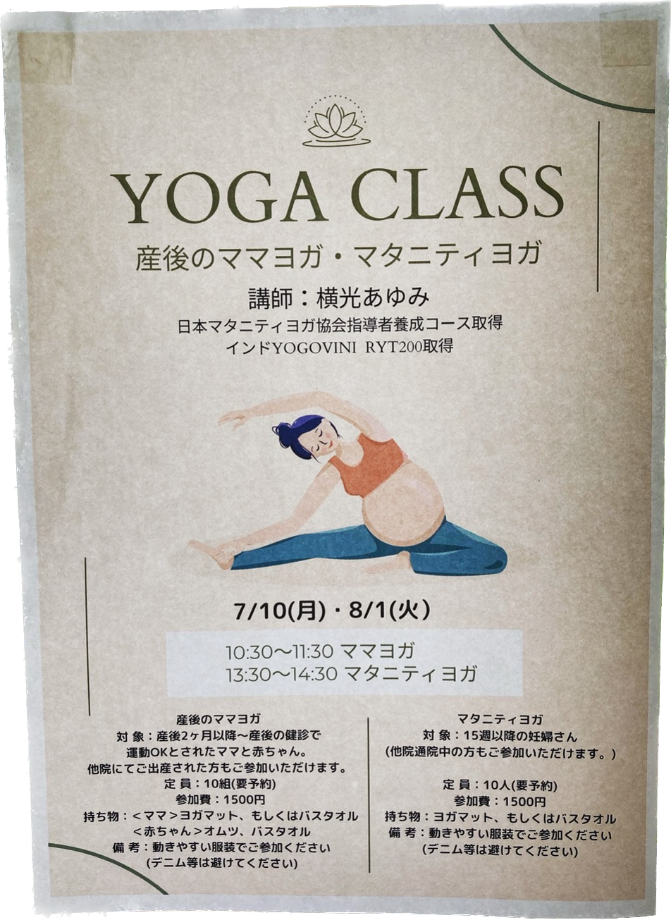 7月10日(月)・8月1日(火)に産後のママヨガとマタニティヨガを行います。